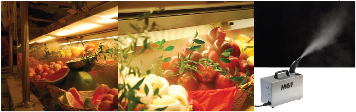Пример за приложението на FOGGY системата, на щанд за плодове в супер маркет